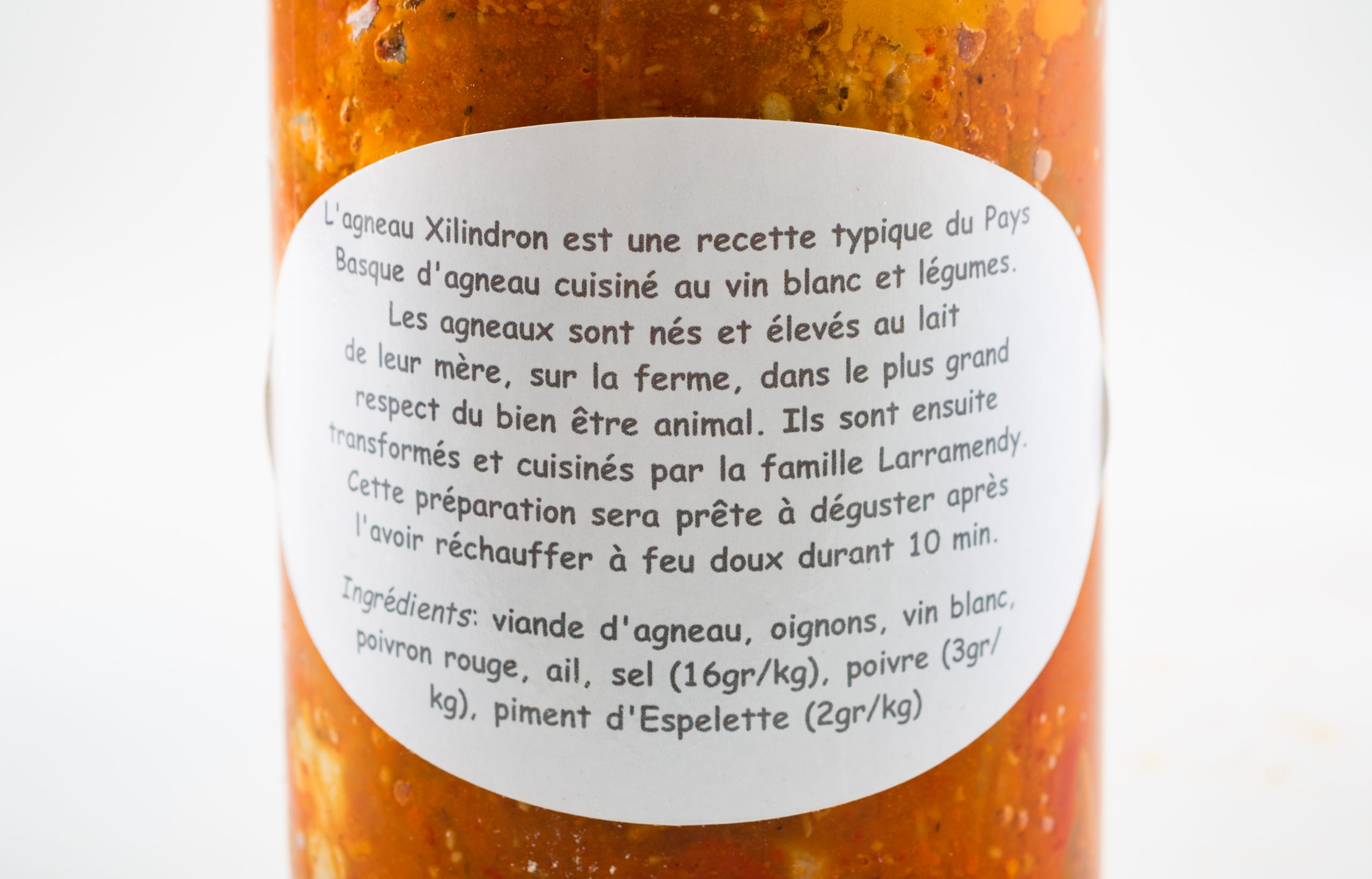 L’agneau Xilidron est une recette typique du Pays basque d’agneau cuisiné au vin blanc et légumes. Les agneaux sont nés et élevés au lait de leur mère, sur la ferme, dans le plus grand respect du bien être animal. Ils sont ensuite transformés et cuisinés par la famille Larramendy. Cette préparation sera prête à déguster après l’avoir réchauffer à feu doux durant 10 min.